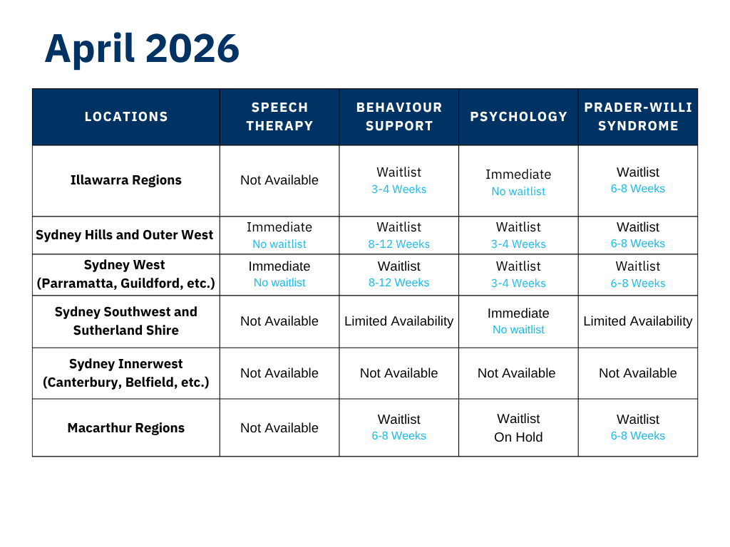 With the growing demand for Behaviour and Allied Health Services, our team of clinicians has recently expanded services in Wollongong, Central Coast, Newcastle, Sydney, Campbelltown and Macarthur regions. Please see below for our February 2026 service capacity: